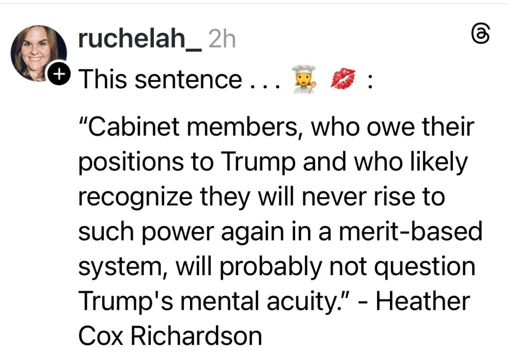 There are dozens of examples everywhere, everyday of this ongoing destruction. Much of what is being done though illegal and being contested in courts, is destroying our infrastructure in ways that it will not recover from. It is why the most Conservative antigovernment representatives in our current Congress will continue to stand by Trump. At this point each Representative’s own ego is so invested in a the Freedom Caucus’s near zero taxed America and its becoming an outwardly demonstrable Conservative Christian America, that they value nothing else and Trump can do what ever he likes. The reality is that Trump being psychologically unwell gives them an open road to steal, kill and destroy any other vision of American life but their own. They do not take him seriously because to do so would interrupt their own agenda. Nebraska Congressman Mike Flood and others know that when he goes, so does their craved for golden hour. They are now loyal beyond what even they can comprehend.
